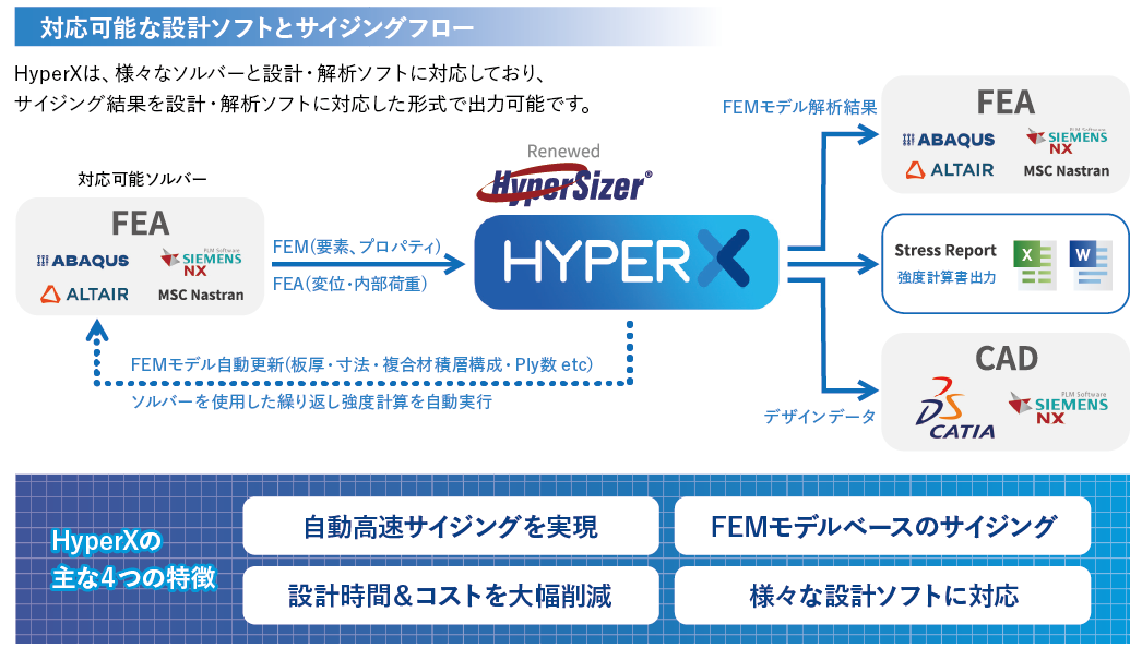HyperXは、米国Collier Aerospace社がNASAラングレー研究所で開発されたソフトウェアプログラムをベースに開発した有限要素モデル(FEM)を使用した、構造ストレス自動サイジングソフトウェアです。従来の金属や複合材の強度計算手法をソフトウェア化したもので、FEMモデルをベースにストレスエンジニアが強度計算や構造ストレスサイジングを瞬時に行うことができ、設計プロセスにかかる時間とコストを大幅に削減することができます。